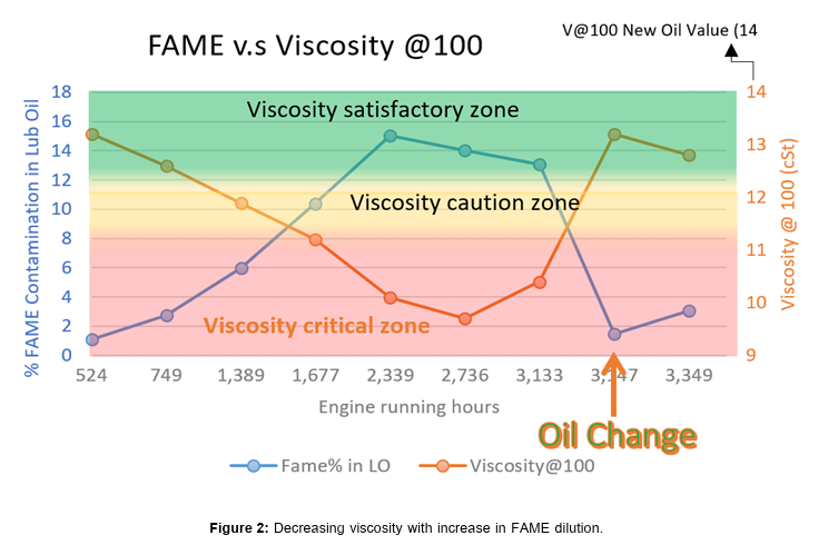 A typical SAE (Society of Automotive Engineers) 30 grade engine oil has a viscosity of about 90 to 110 cSt at 40°C and a B100 (100% FAME) or its fossil counterpart such as DMA (distillate fuel) has a viscosity in the range of 4 cSt at 40°C. Any contamination of the fuel (distillate or Bio distillate blends contain FAME) into the used engine oil can therefore significantly reduce the viscosity of the used engine oil.