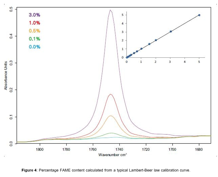 Since there are typically no overlapping bonds with the lubricating oil, the percentage FAME content can be calculated from a typical Lambert-Beer law calibration curve.